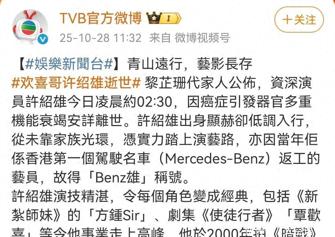 许绍雄在10月28日凌晨去世了,医生说是癌症导致器官衰竭。今年76岁,演过《使徒行者》里的欢喜哥,很多粉丝在社交平台悼念。TVB也发微博说再见。